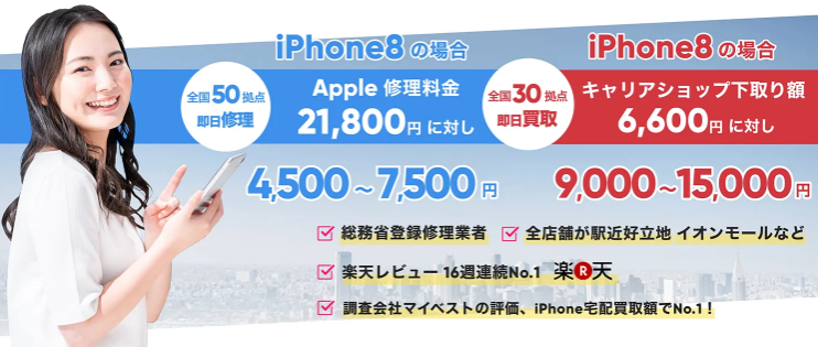 | 特徴 | ・高品質パーツを使用しながら低価格で即日修理を提供 ・全国50店舗以上で展開 |